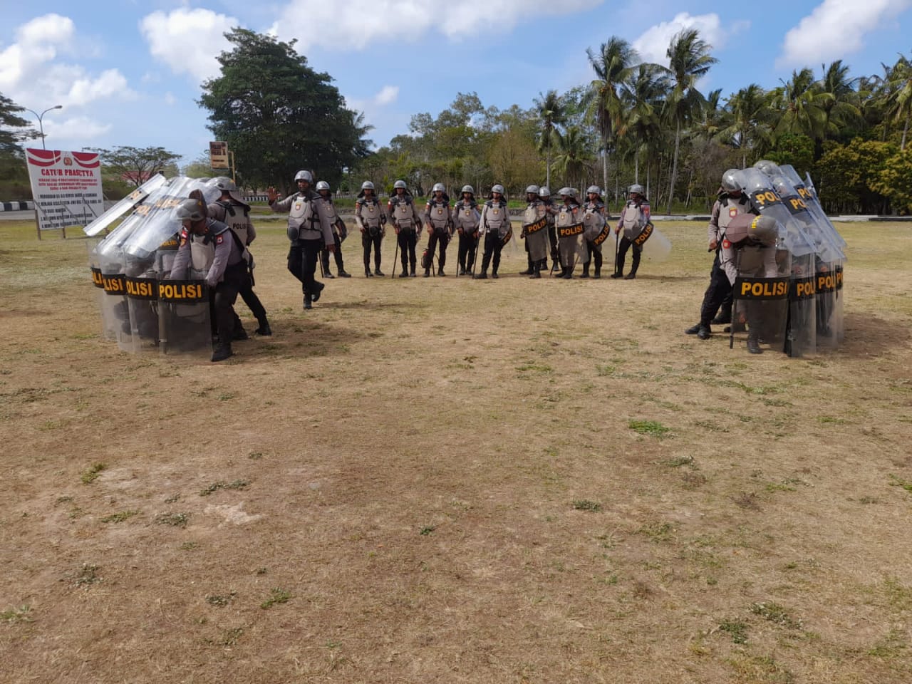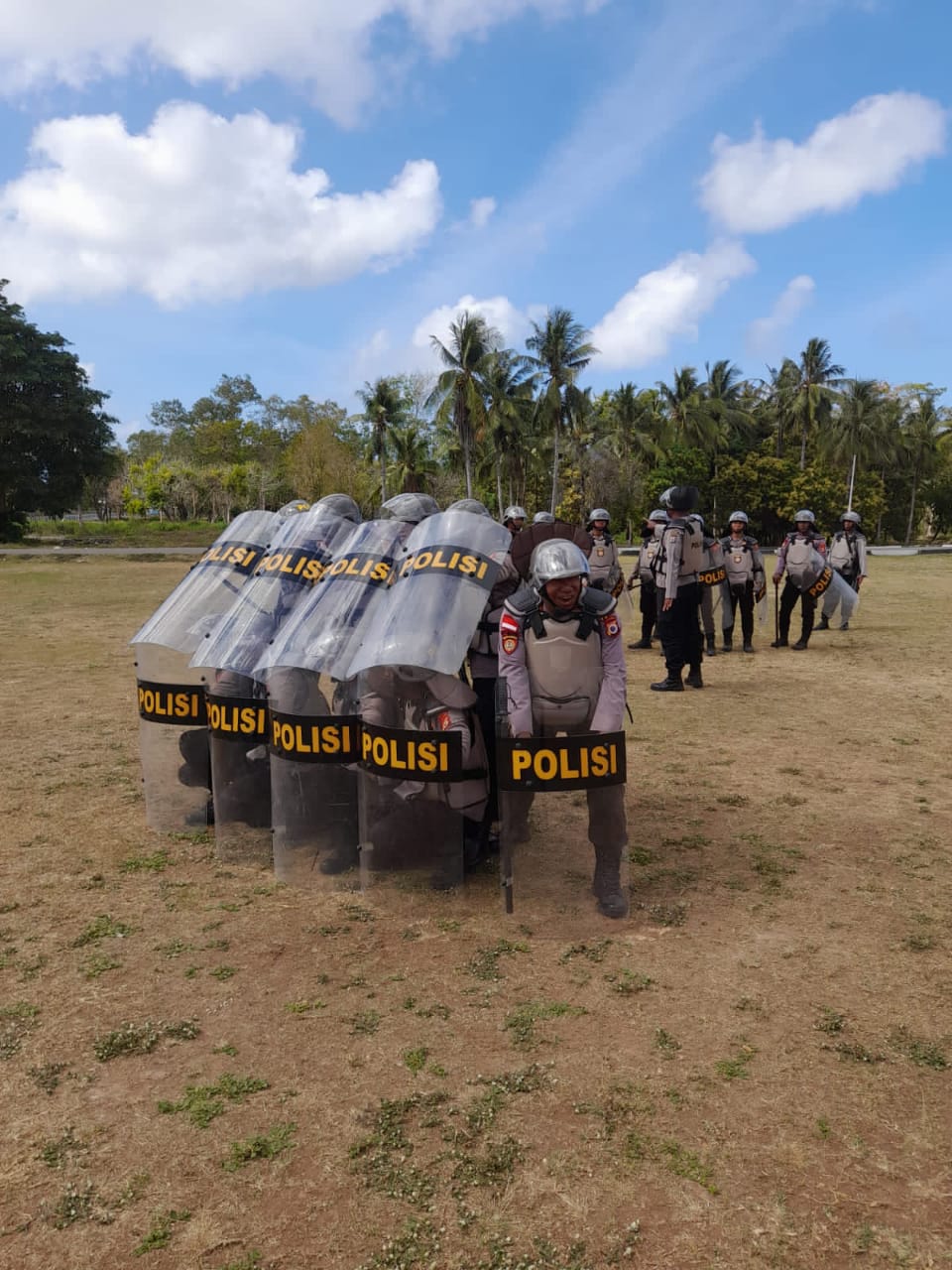 Latihan tersebut dipimpin oleh Bripka Anthon Patileuw dan didampingi oleh Bripka Jufran Borolla dengan mengikut sertakan personel Satuan Samapta menggunakan perlengkapan peralatan Dalmas berupa Rompi, Tameng, Helm, Tongkat, Flas Ball (gas air mata) serta alat Damkar.