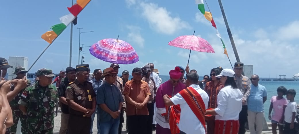 MediatorMalukuNews.com_ Masyarakat Kecamatan Pulau Babar Timur, Kabupaten Maluku Barat Daya (MBD) antusias menyambut Uskup Diosis Amboina, Mgr. Seno Ngutra dalam kunjungan per-gembalaan-nya di kepulauan terluar itu.